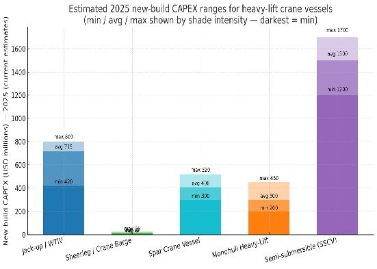 The cost for a new build vessel is likely to be similar to that of a modern monohull crane vessel of a similar size and specification, and estimated to be lower than a modern equivalent spec jack-up. However the spar crane vessel would have a higher poor weather availability and be able to operate in water depths in excess of 80m.
